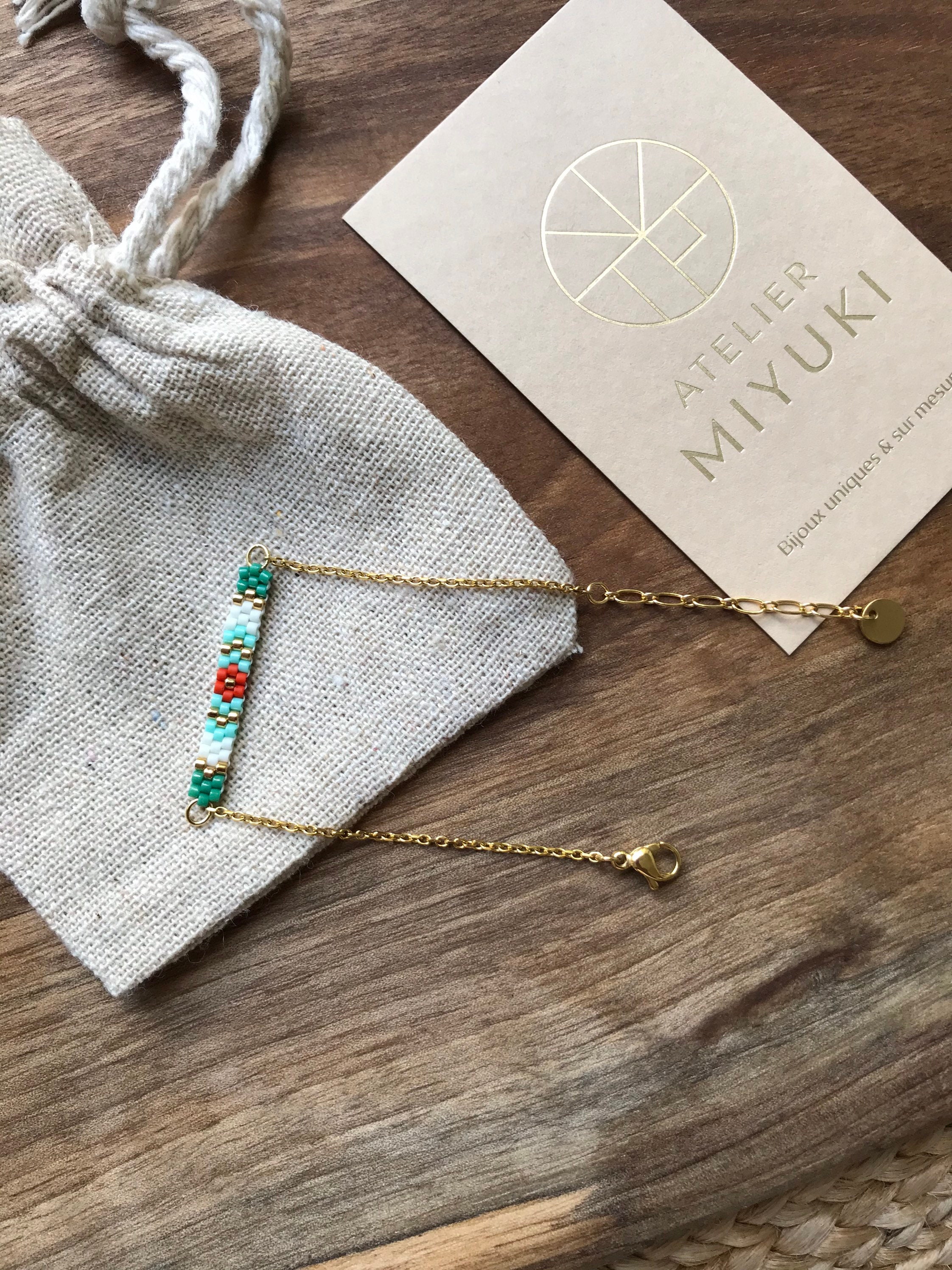 Woven beaded bracelet in coral, green, white, gold & turquoise blue with its gold stainless steel chain (resistant to water and other beauty products) made from Miyuki glass beads.