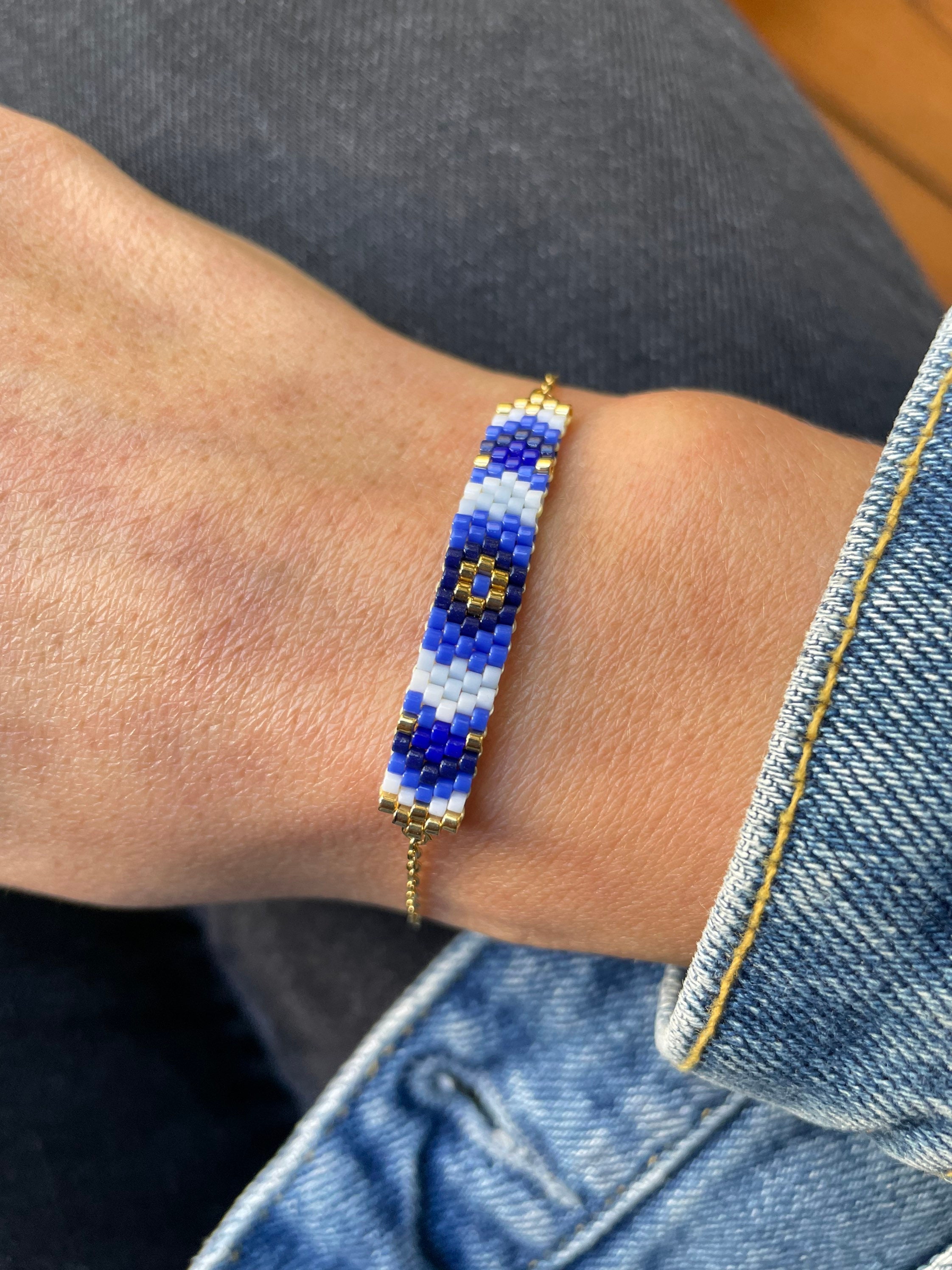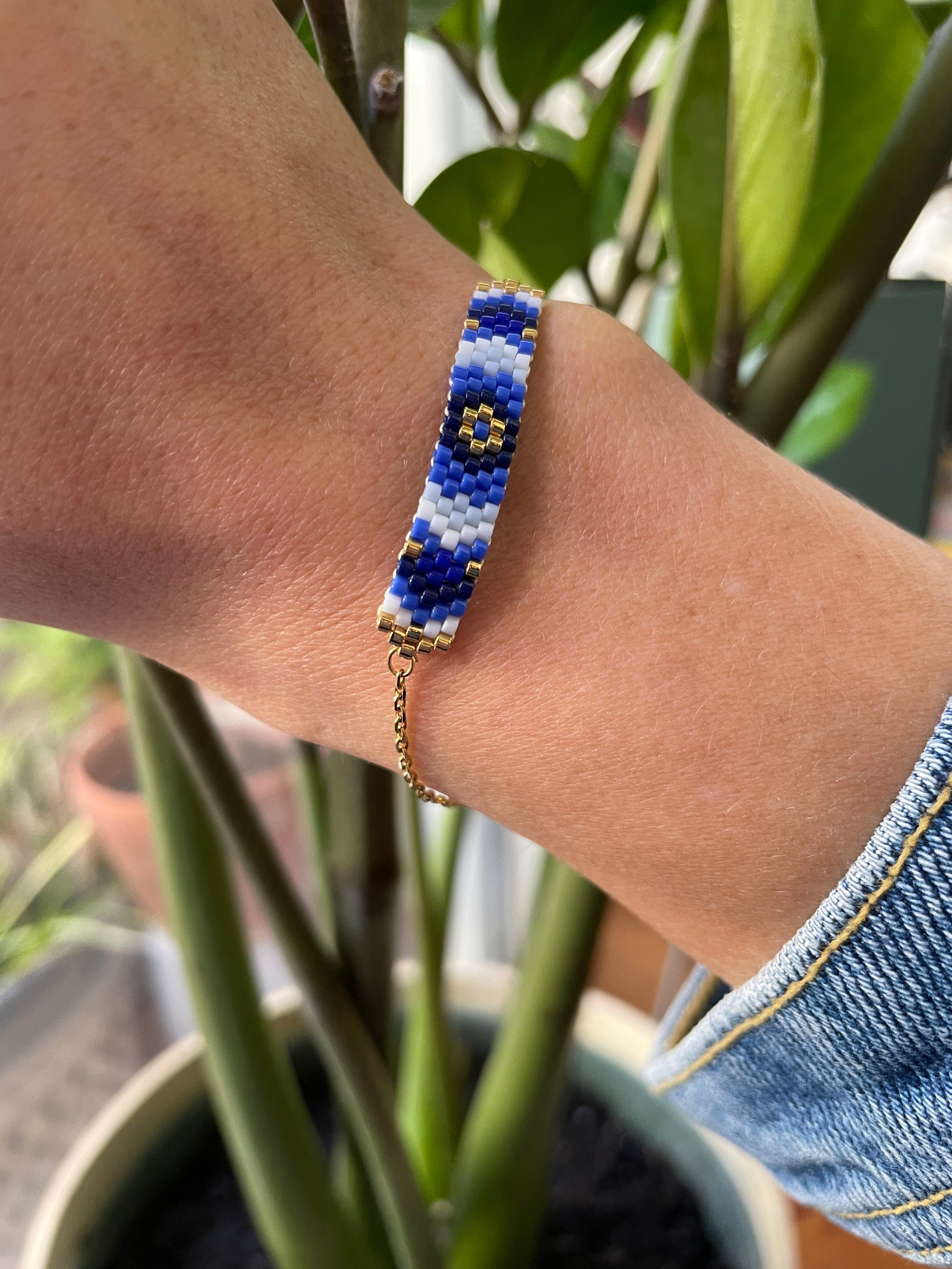 Bracelet woven in a range of blue, white & gold with its gold stainless steel chain (resistant to water and other beauty products) made from Miyuki glass beads.