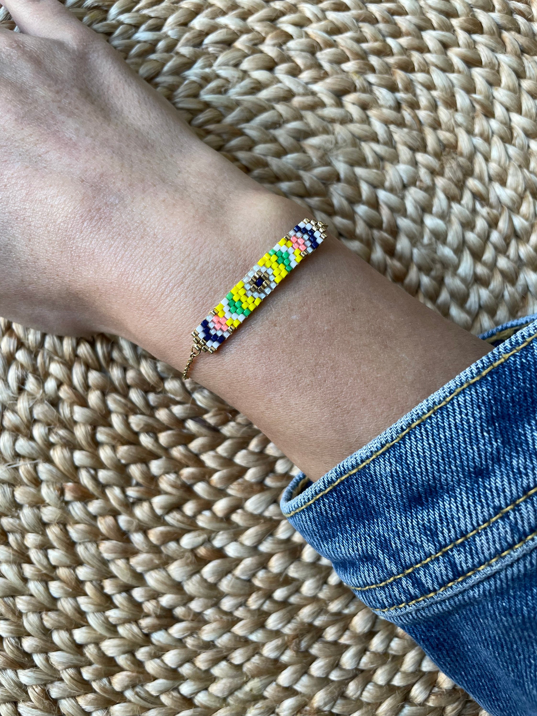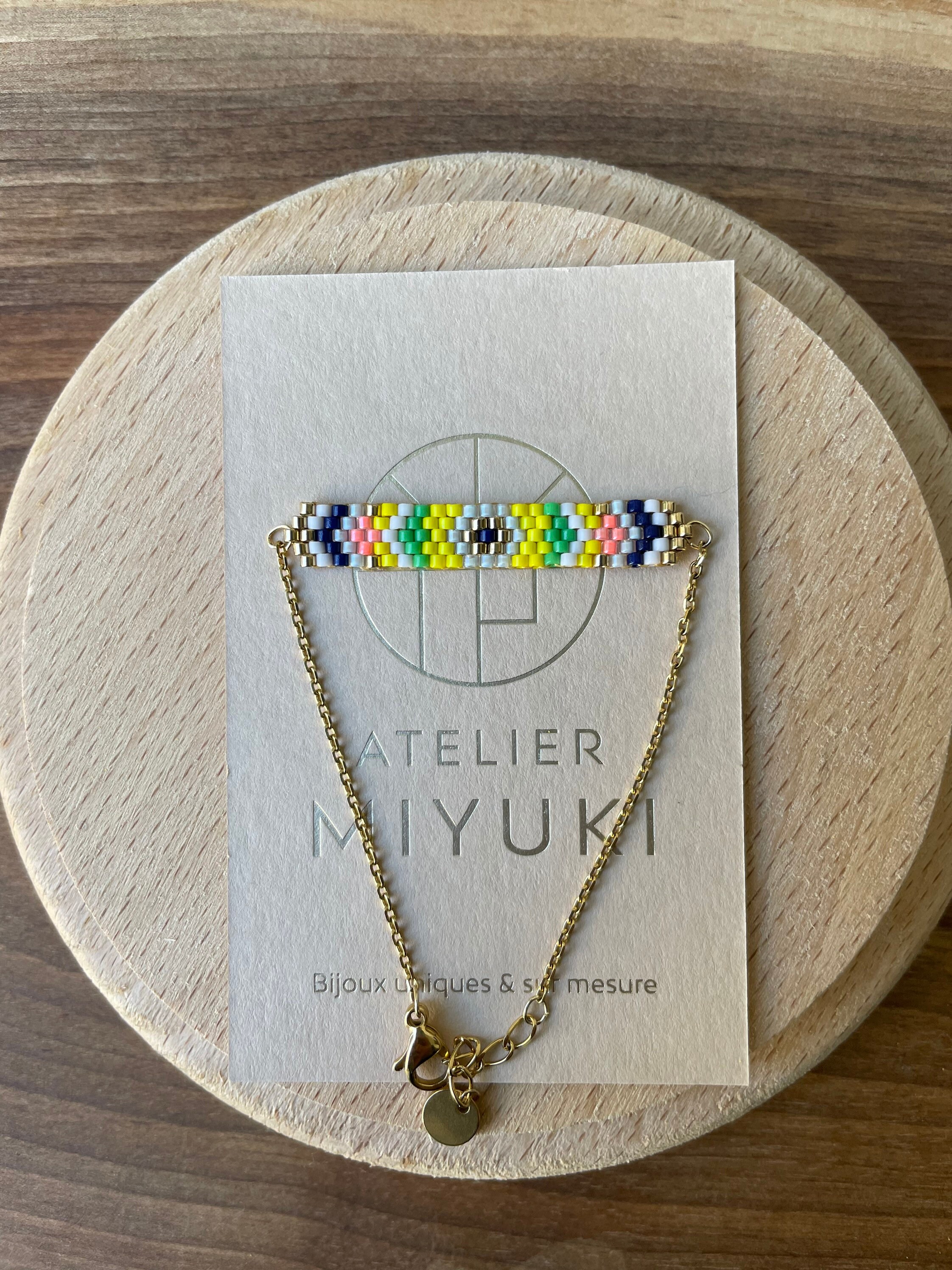 Woven bracelet in shades of yellow, pink, green, blue, white & gold with its gold stainless steel chain (resistant to water and other beauty products) made from Miyuki glass beads.