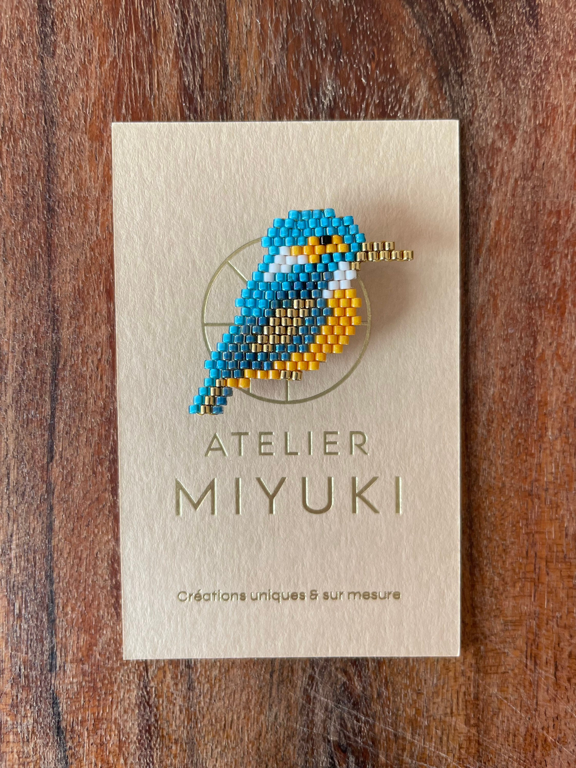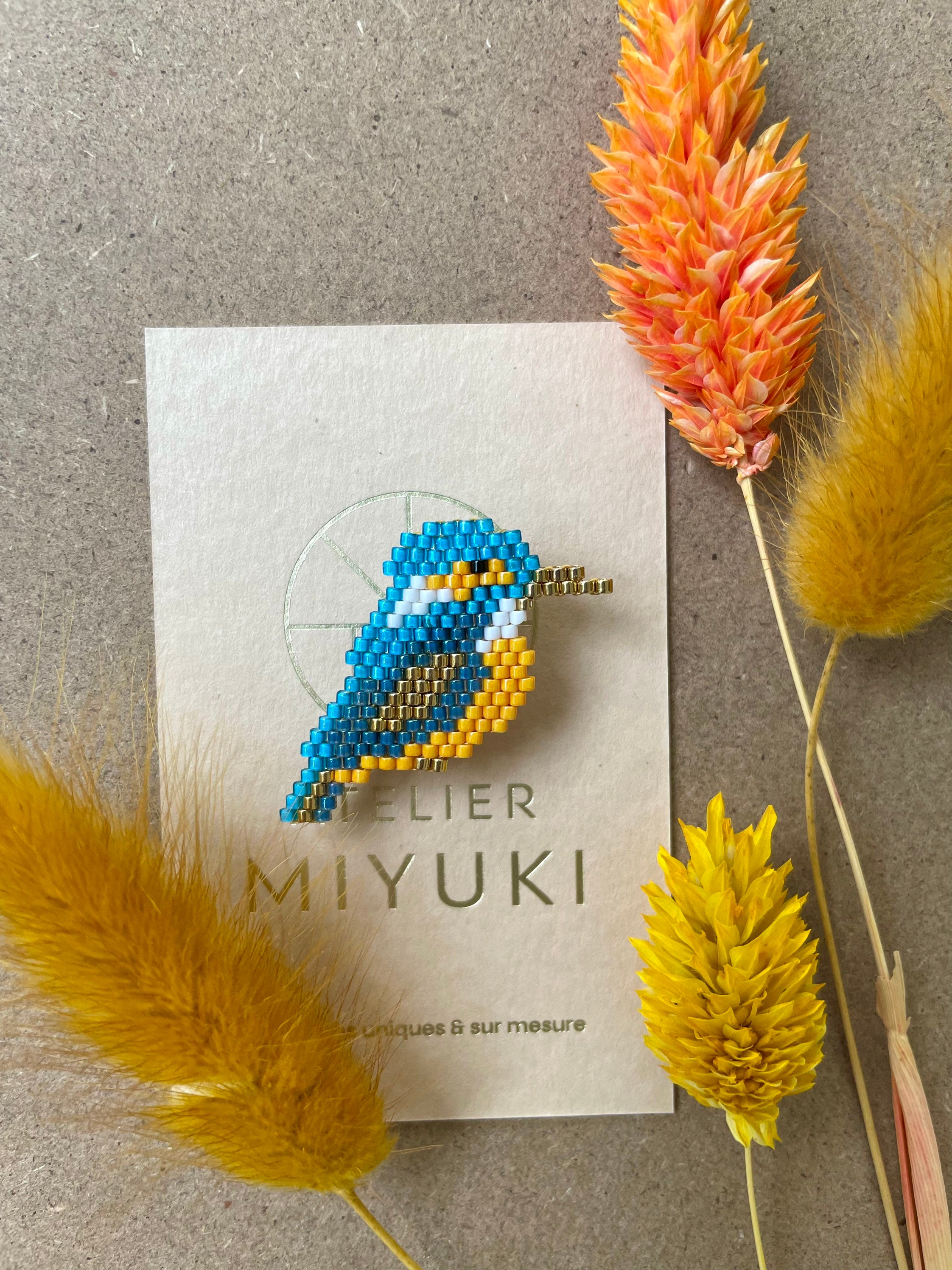 Kingfisher brooch made of glass beads (Miyuki beads)