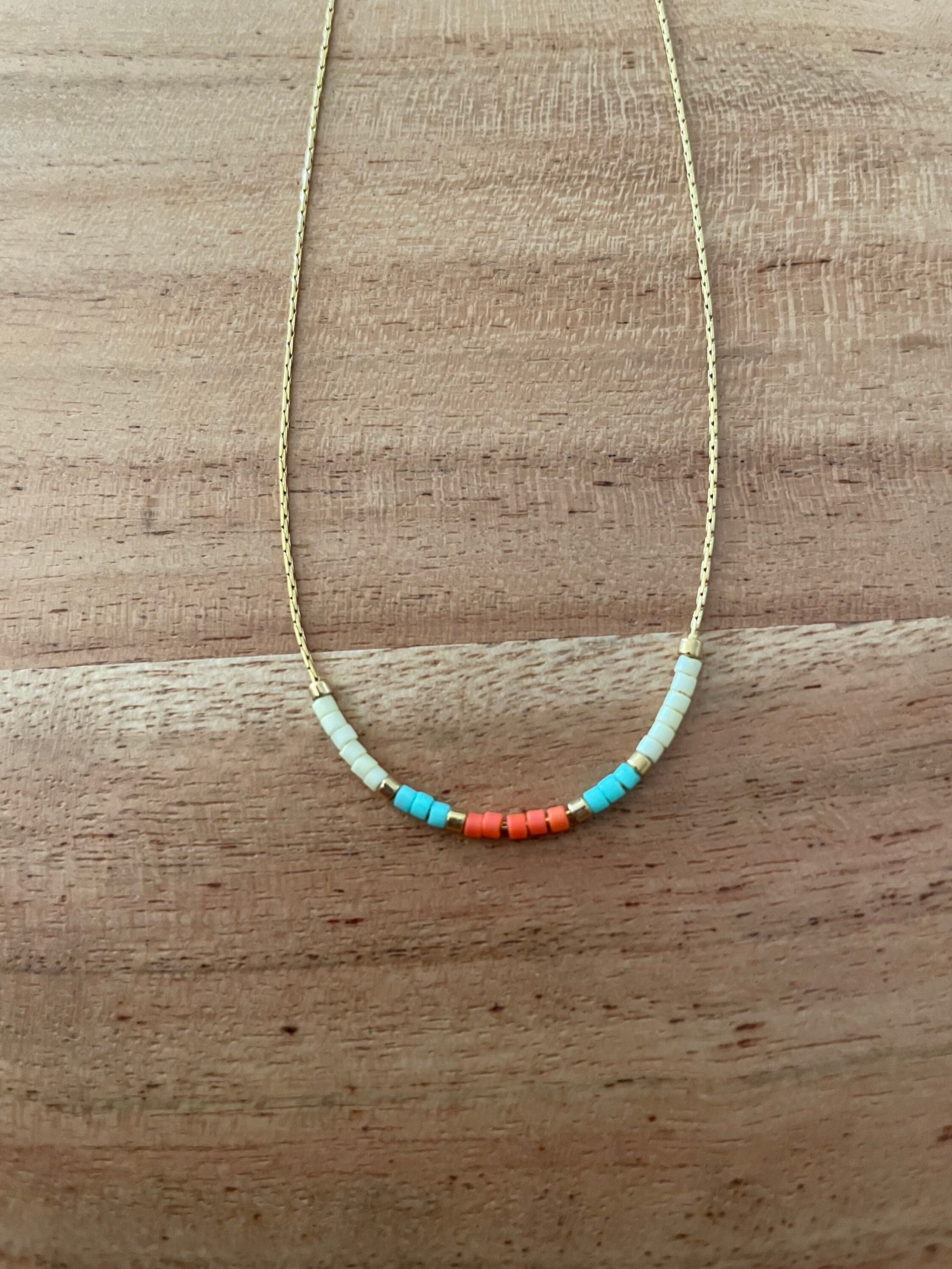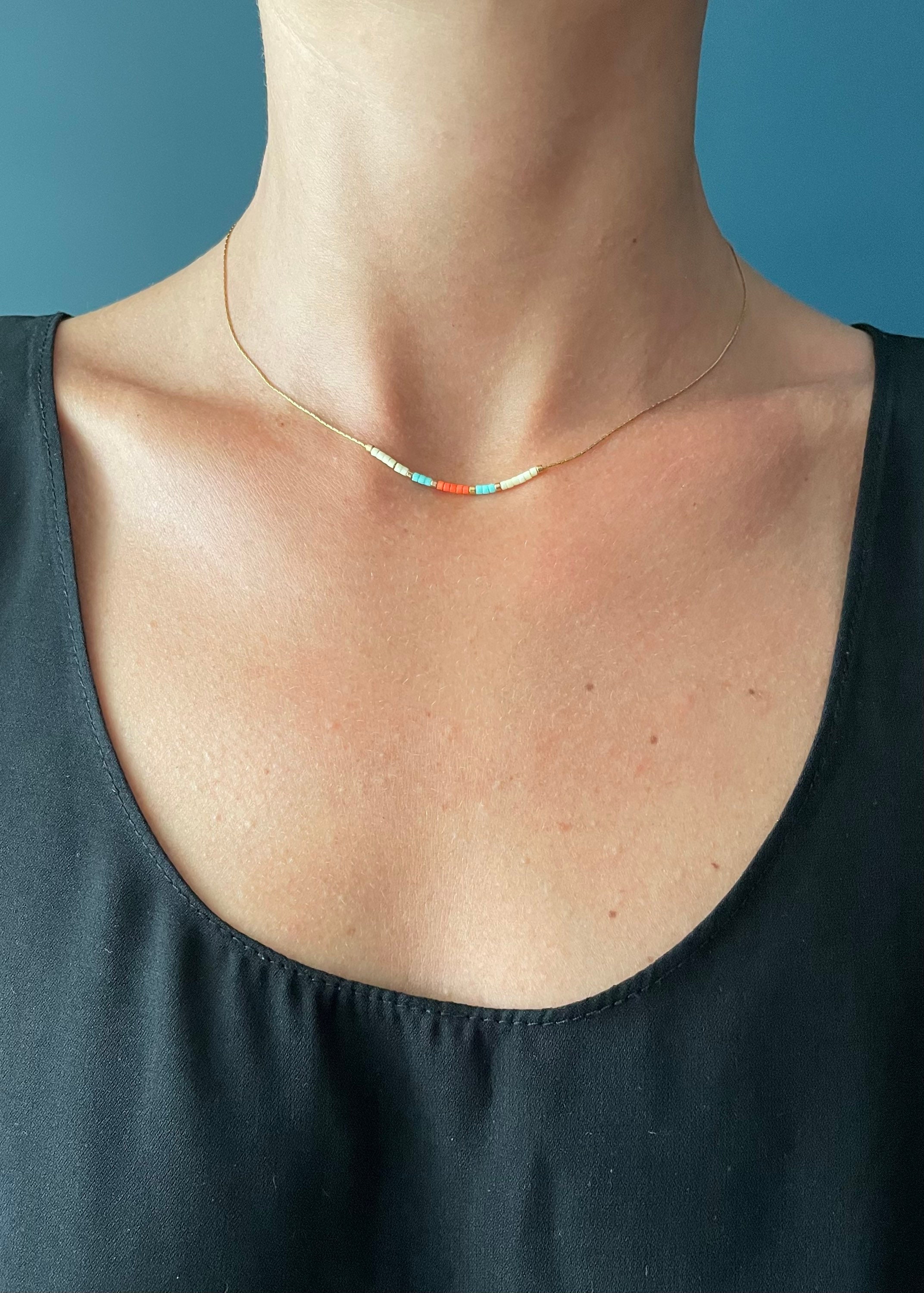 Short, minimalist, adjustable necklace made of Miyuki glass beads mounted on a gold-plated stainless steel serpentine chain. (resistant to water and other beauty products)
