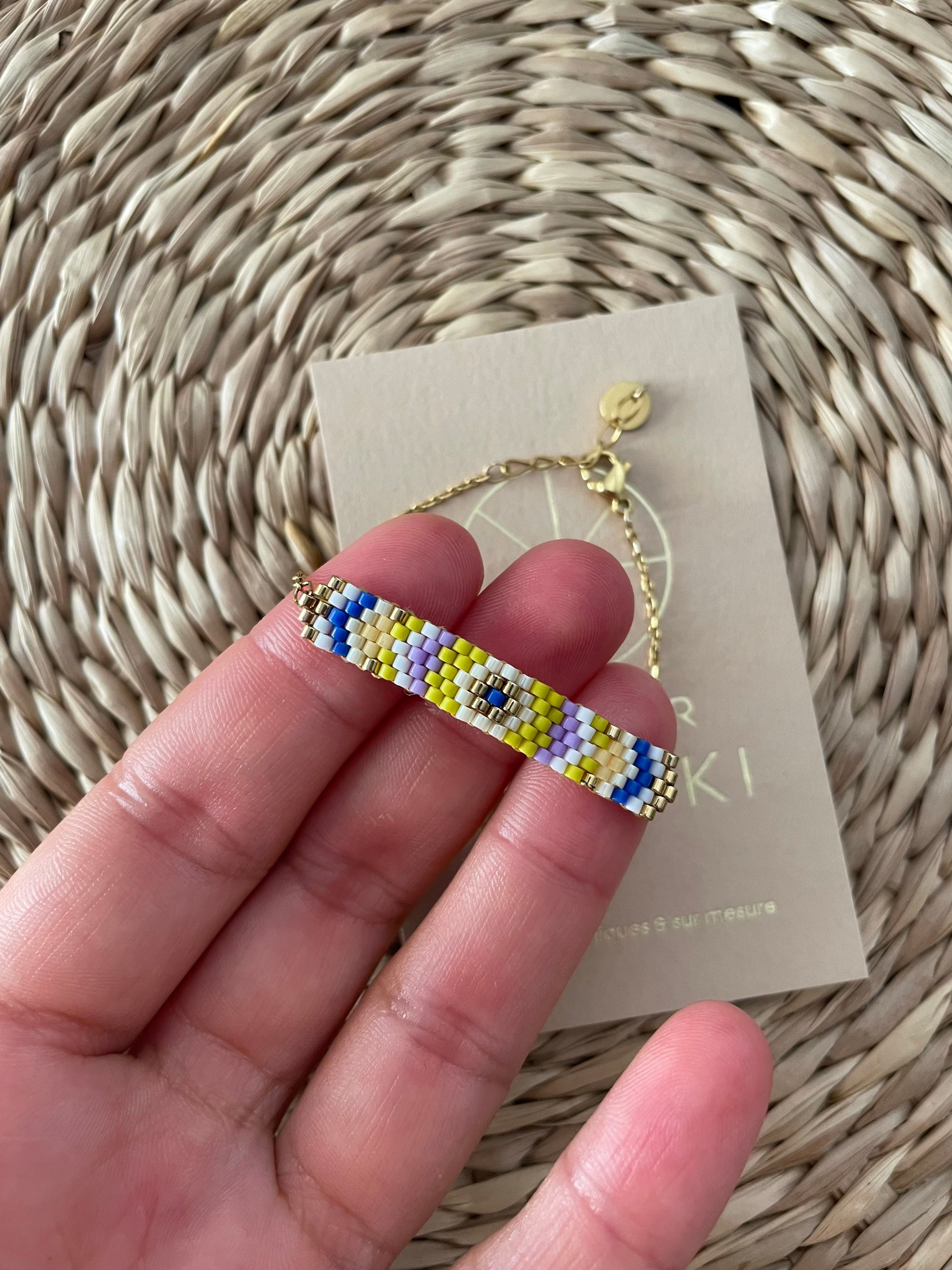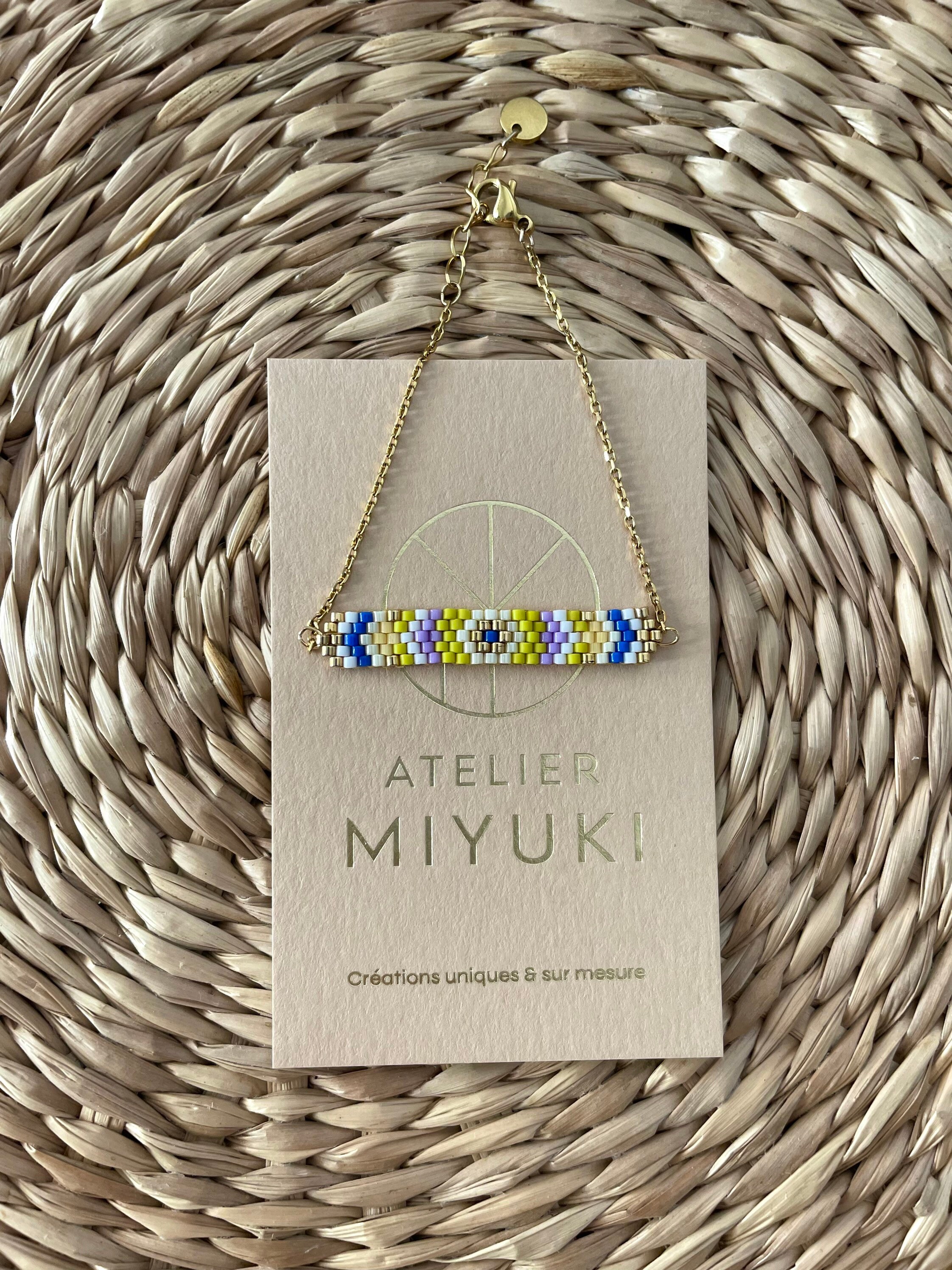 Woven bracelet in shades of blue, purple, green, white & gold with its gold stainless steel chain (resistant to water and other beauty products) made from Miyuki glass beads.