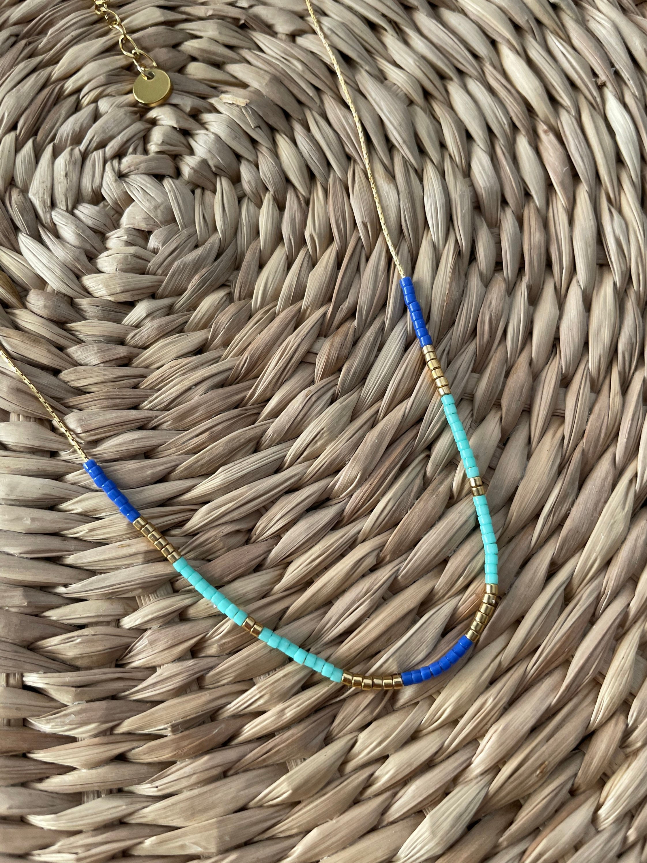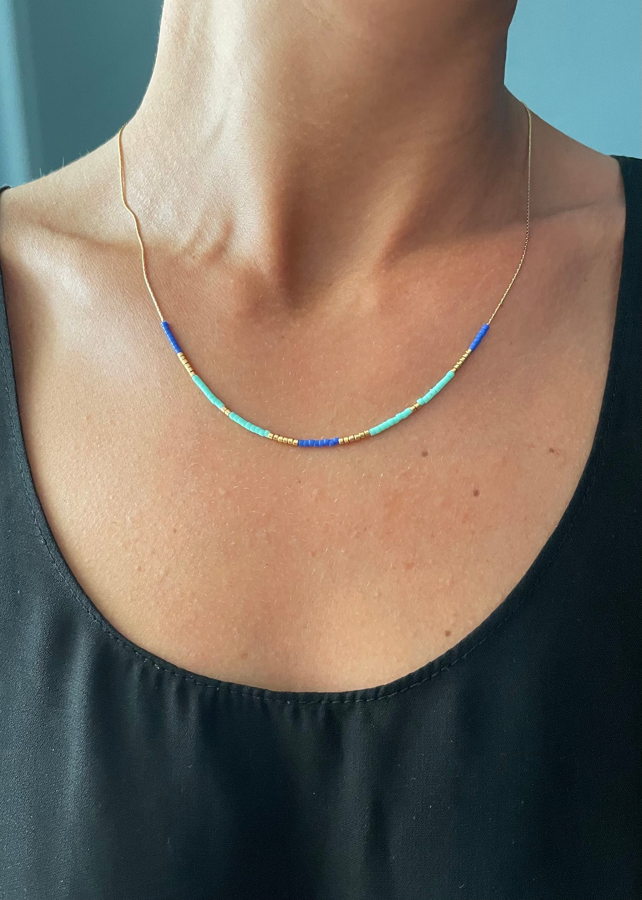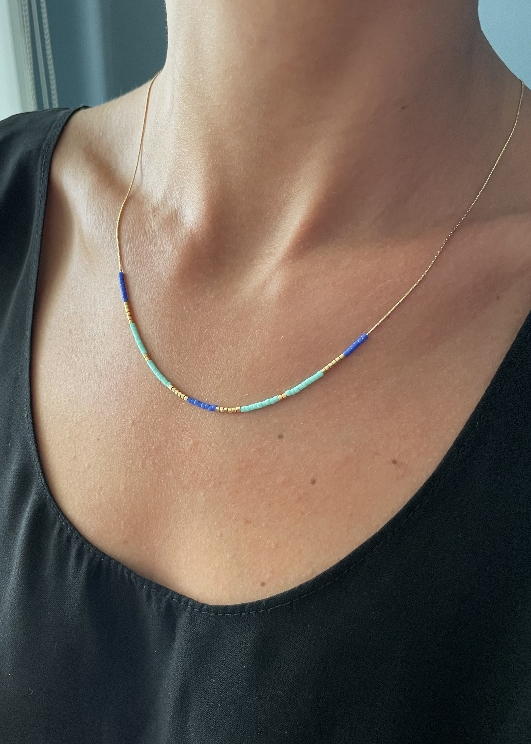 Minimalist adjustable necklace made of Miyuki glass beads mounted on a gold-plated stainless steel serpentine chain. (resistant to water and other beauty products)