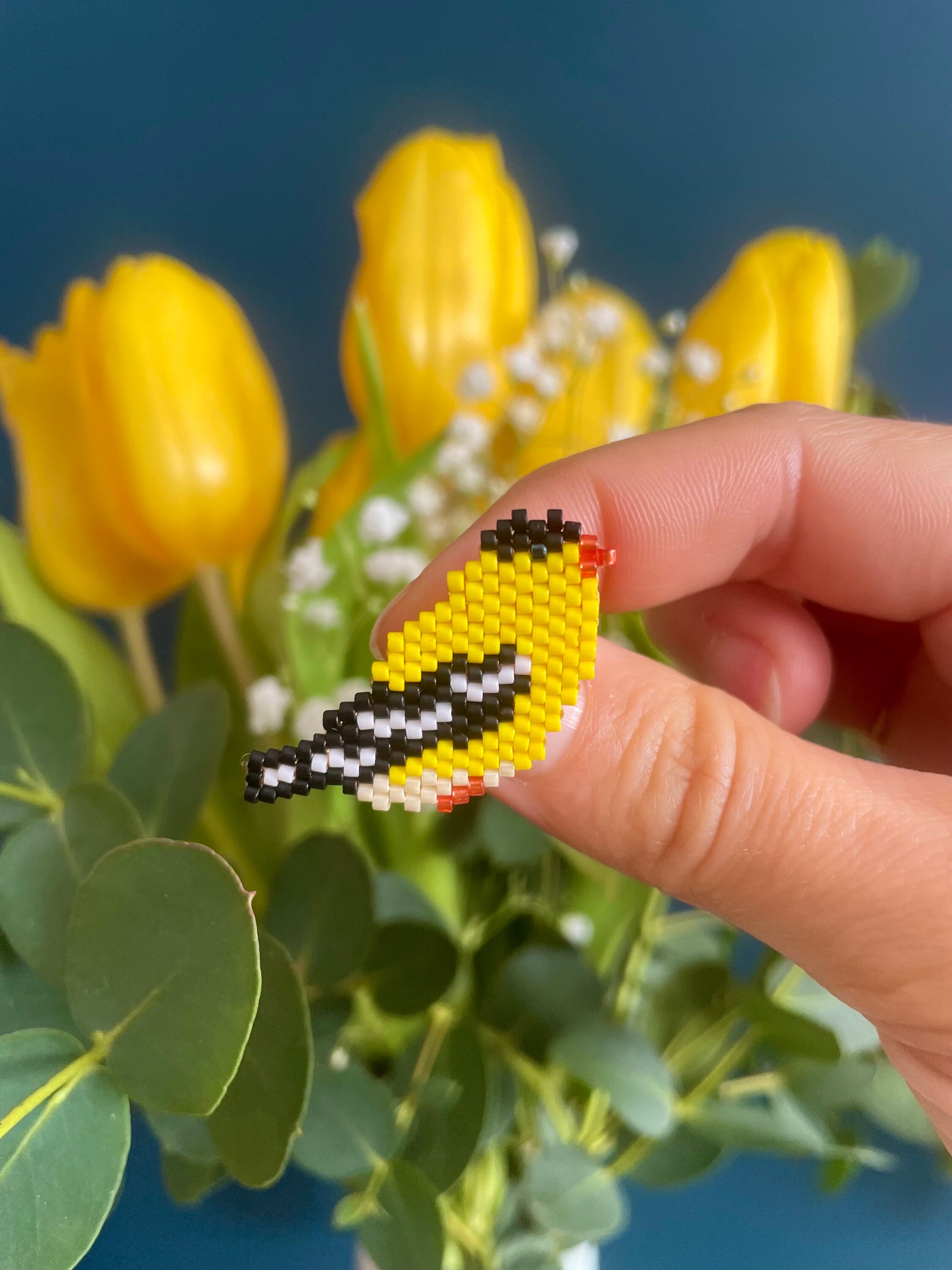 Hand-woven using the brickstitch or peyote technique, bead by bead.