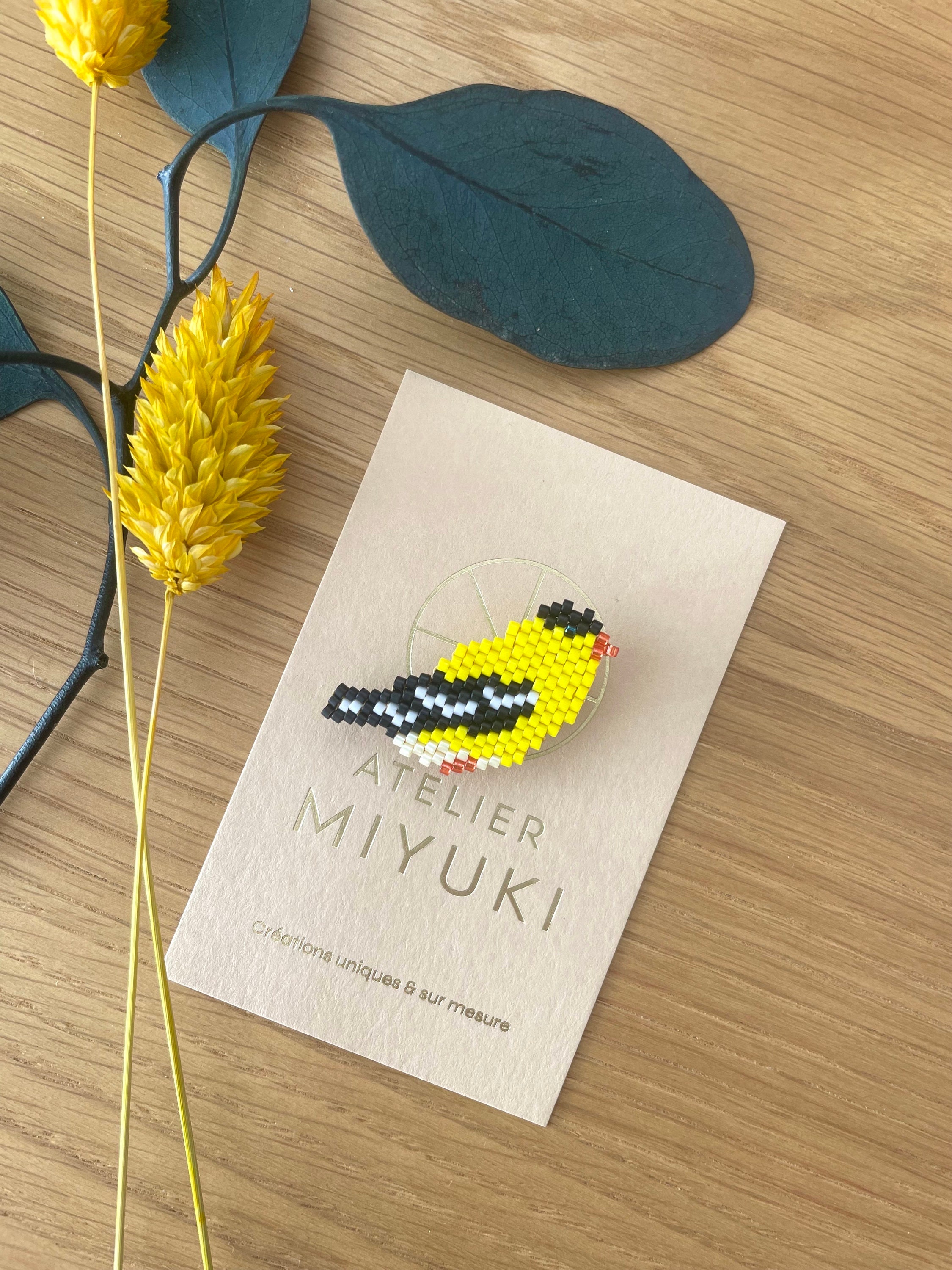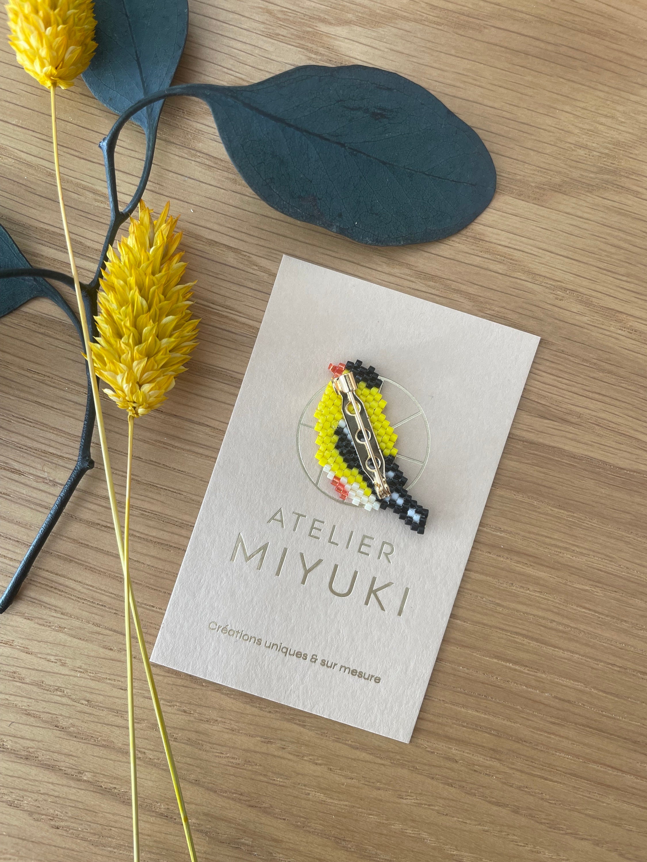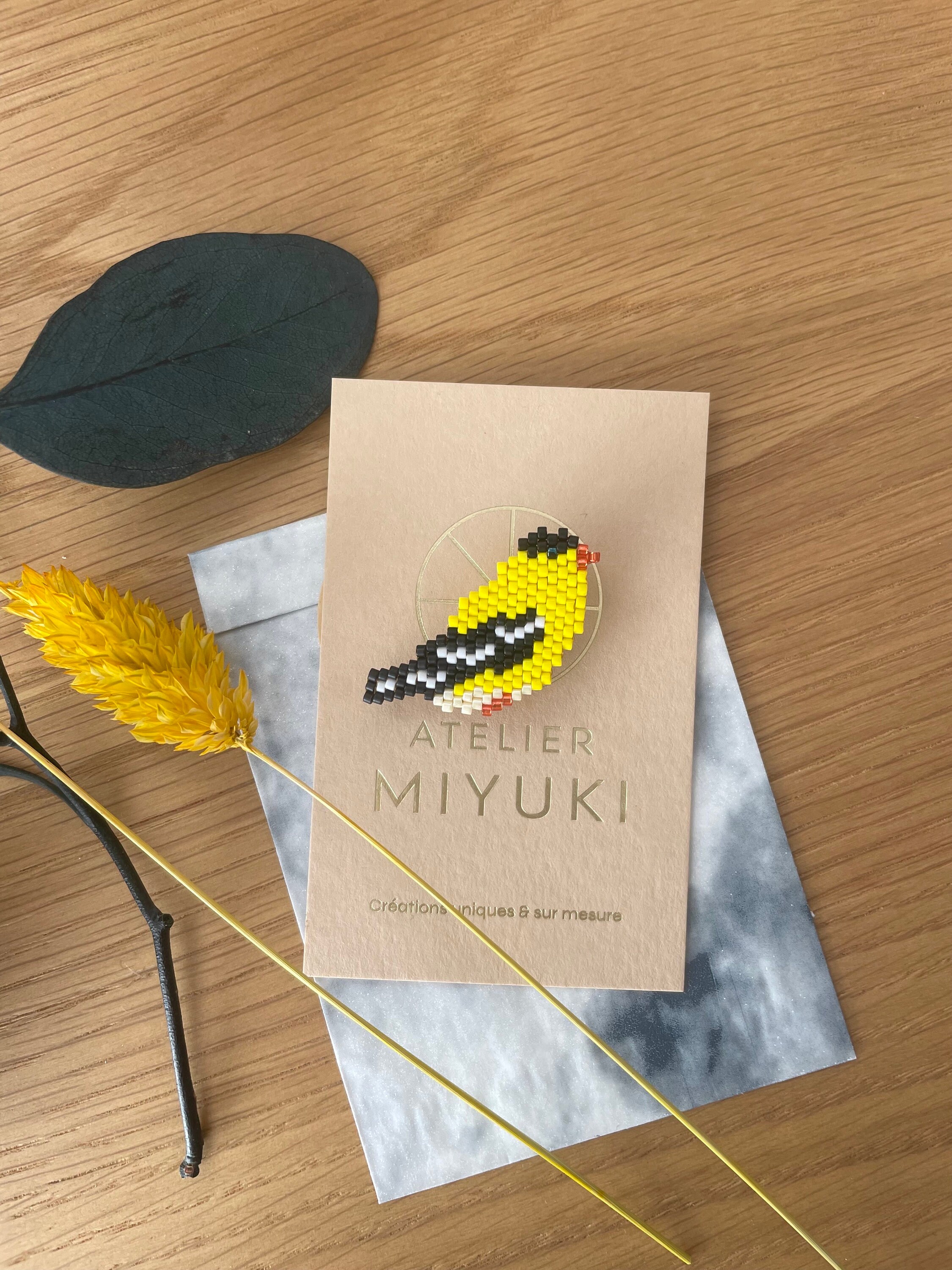 Yellow Goldfinch brooch made of glass beads (Miyuki beads)