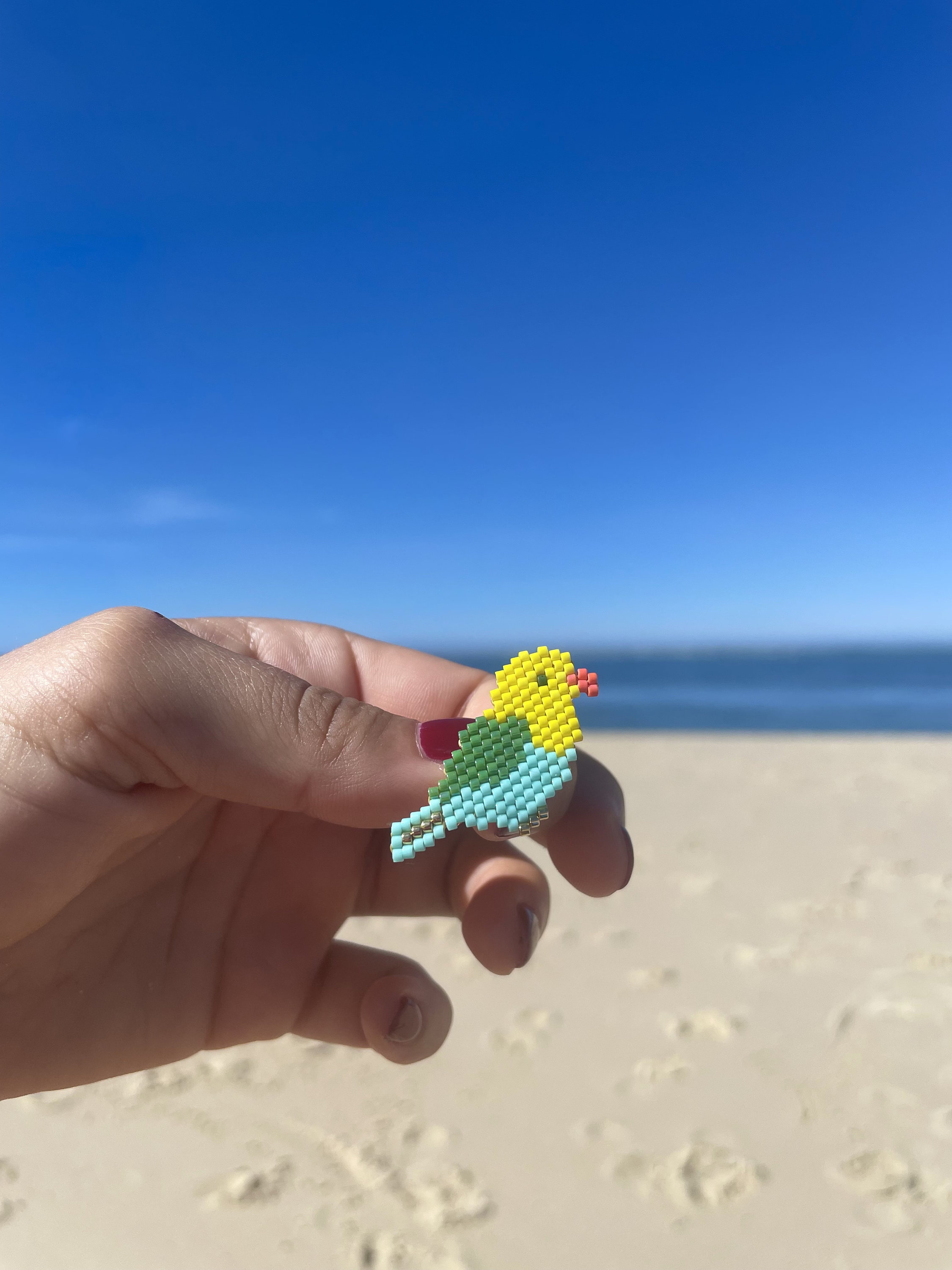 Hand-woven using the brickstitch or peyote technique, bead by bead.