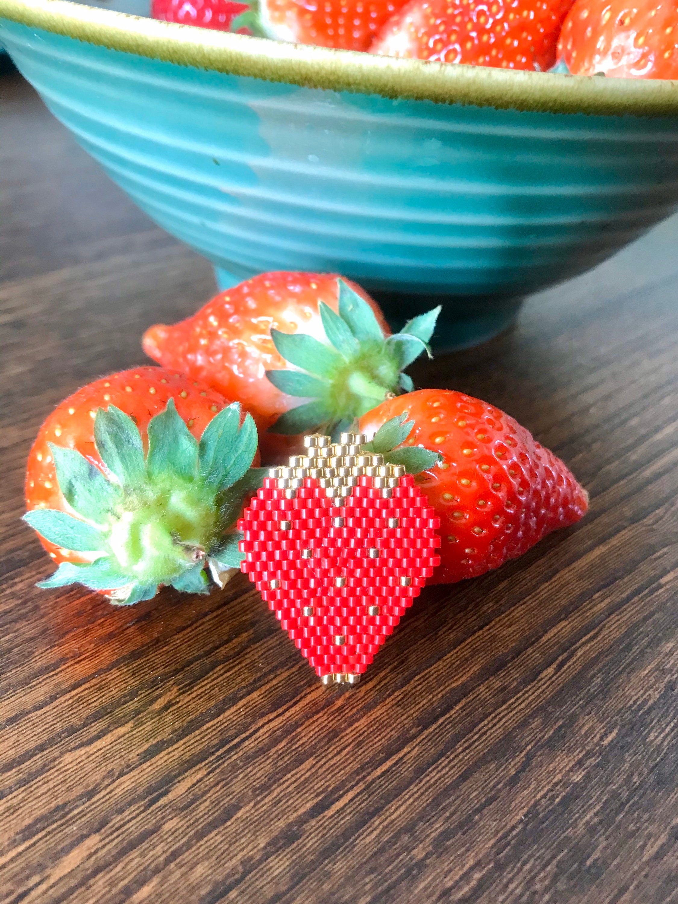 Strawberry-shaped brooch made of glass beads (Miyuki beads)