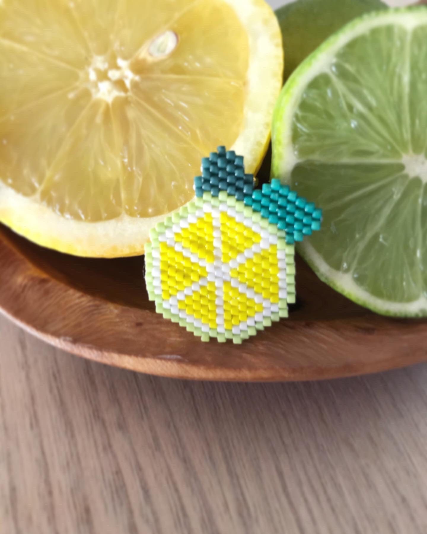 Brooch in the shape of a lemon slice made from glass beads (Miyuki beads)