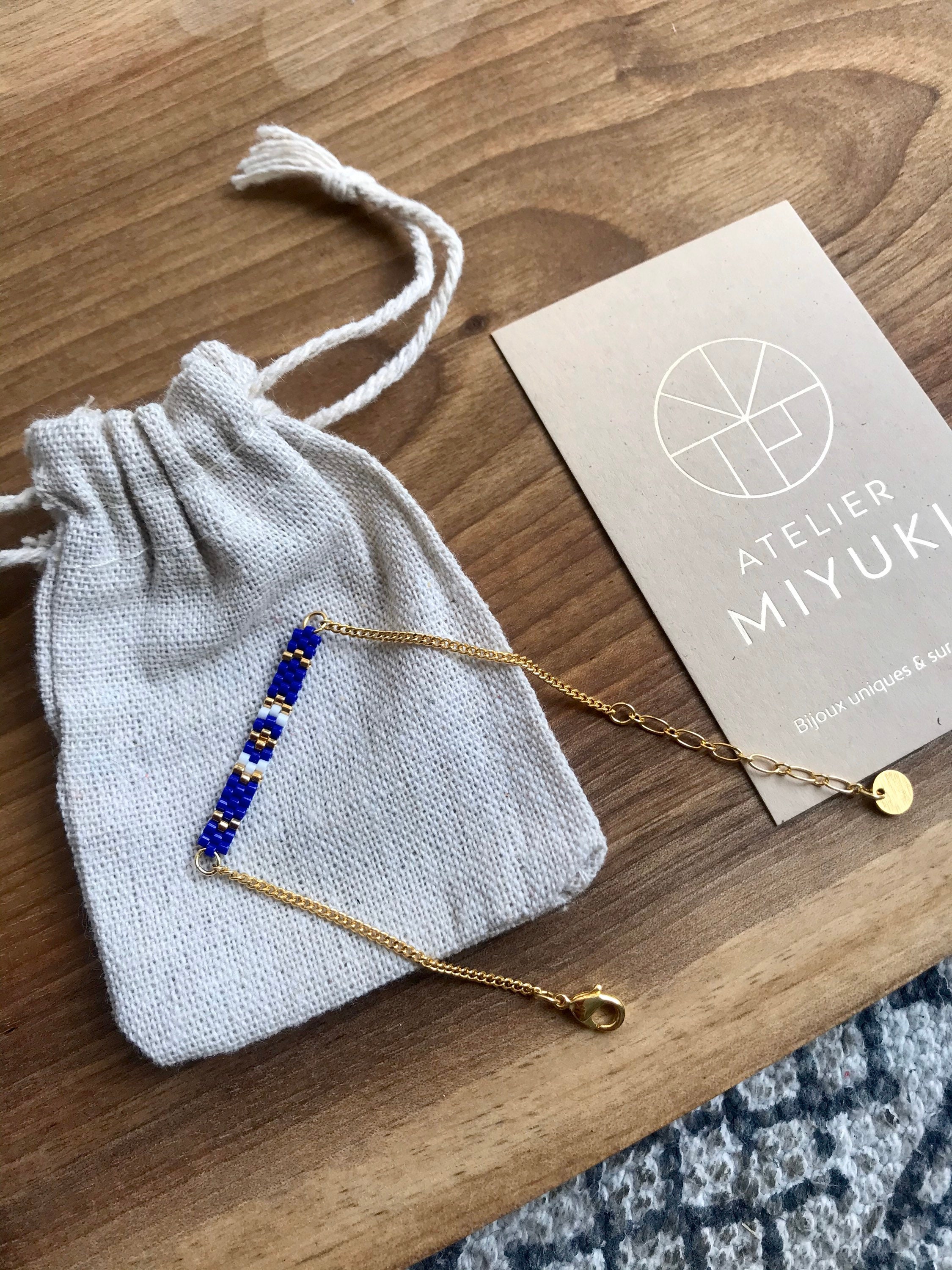 Woven bracelet in blue, white & gold with its gold stainless steel chain (resistant to water and other beauty products) made from Miyuki glass beads.