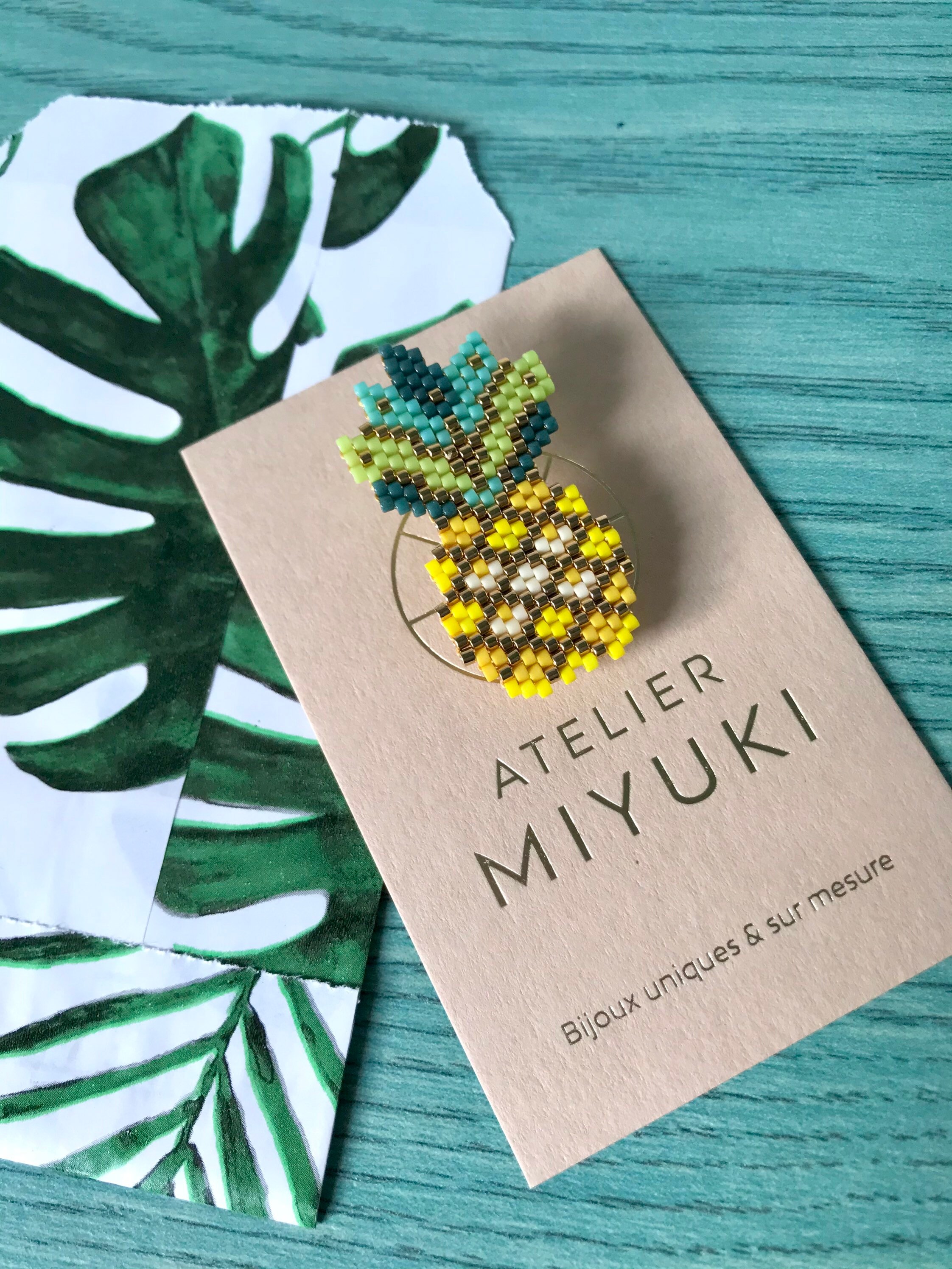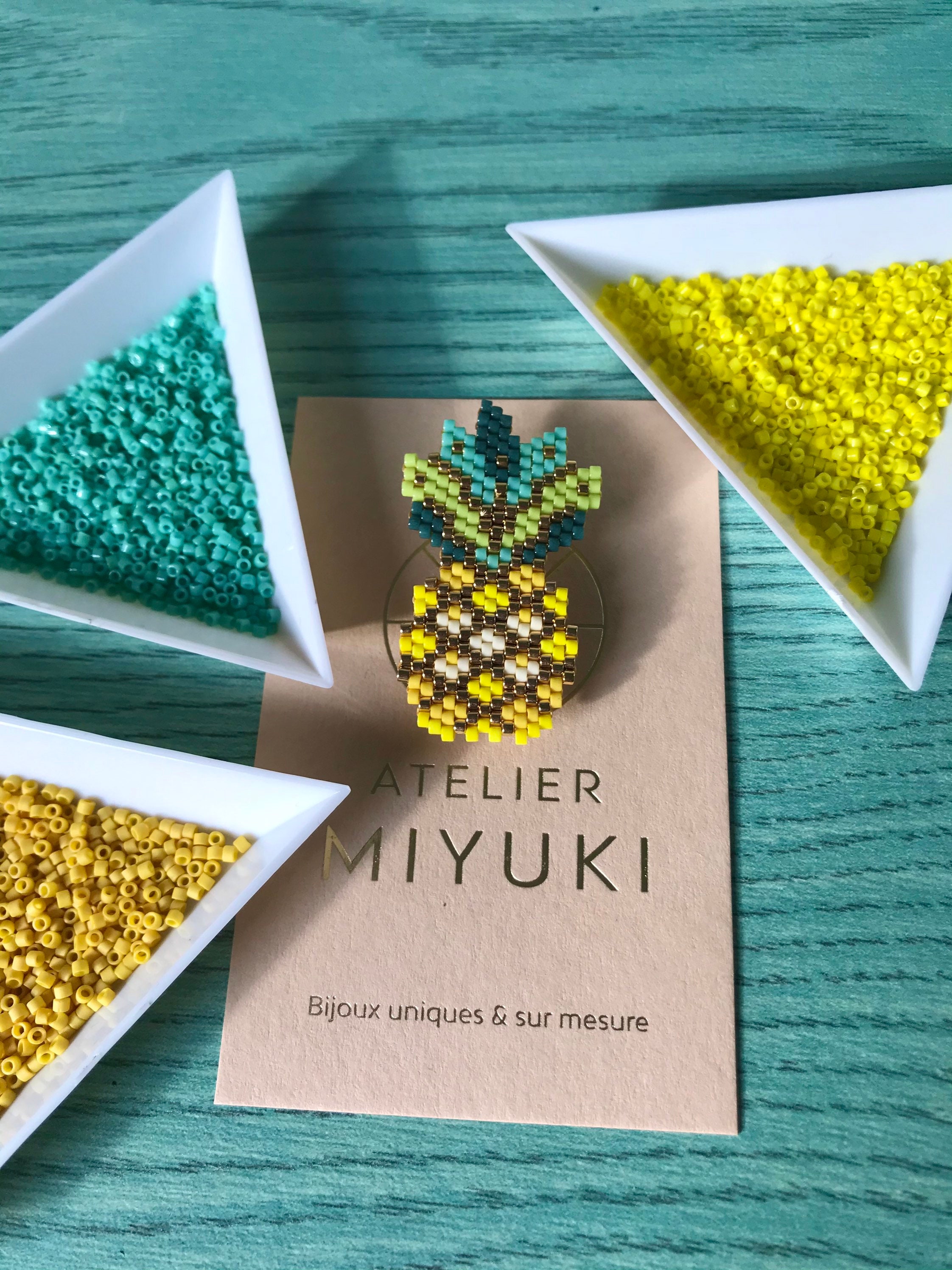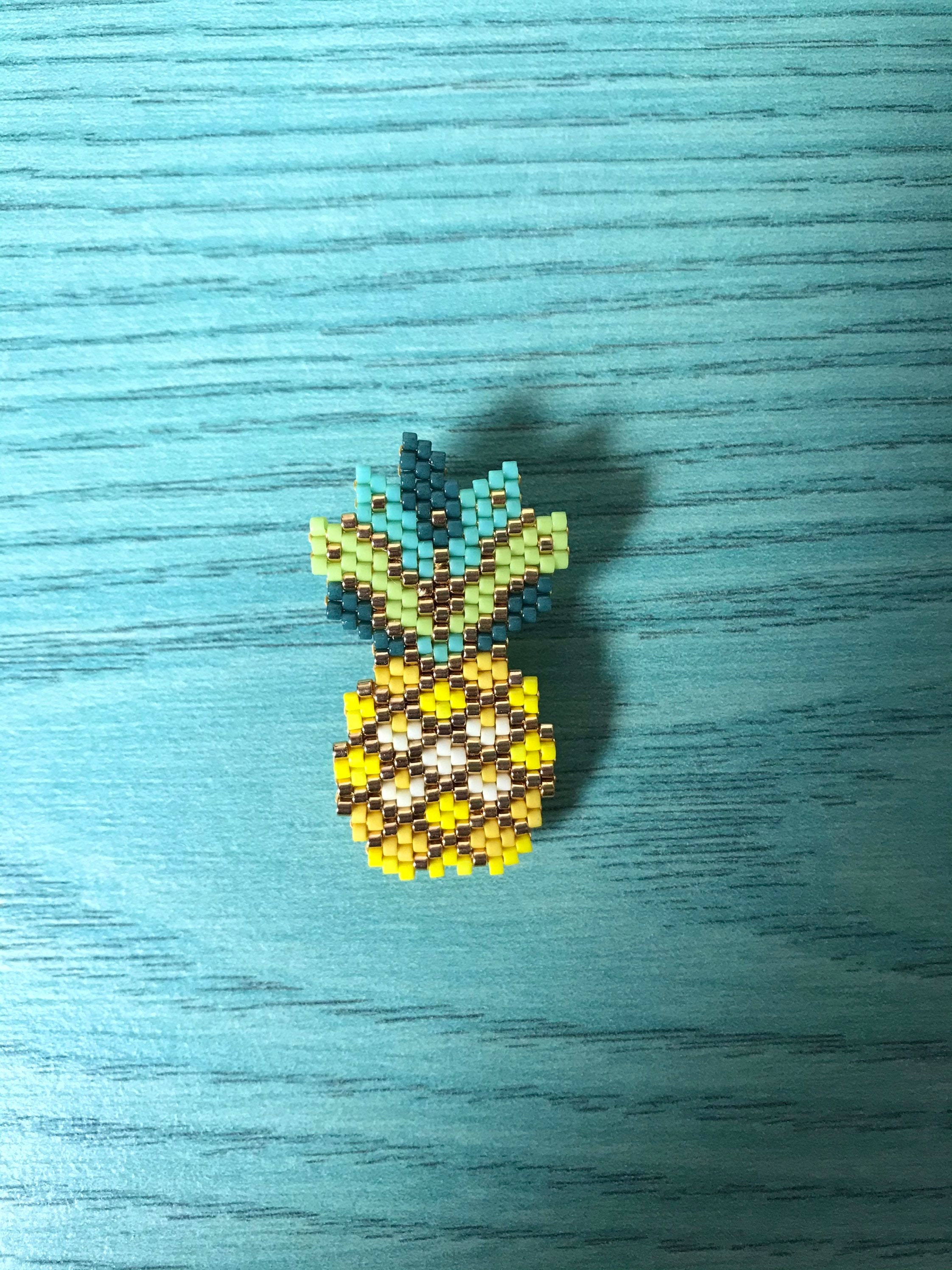 Pineapple-shaped brooch made of glass beads (Miyuki beads)